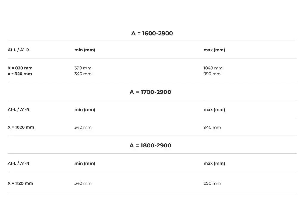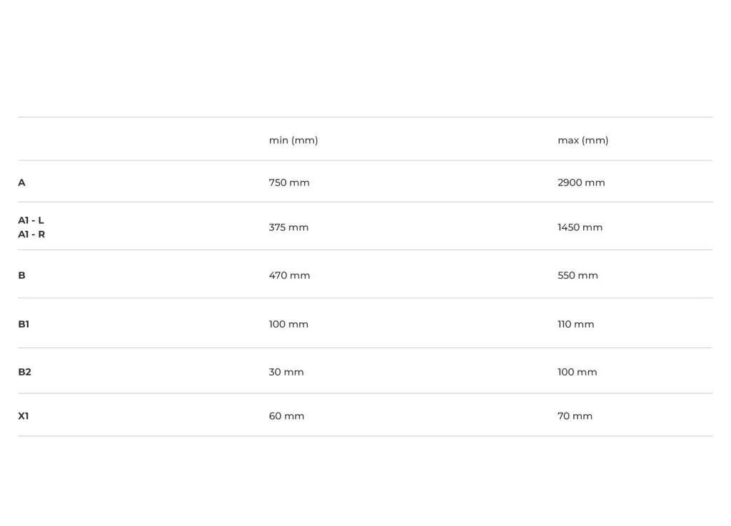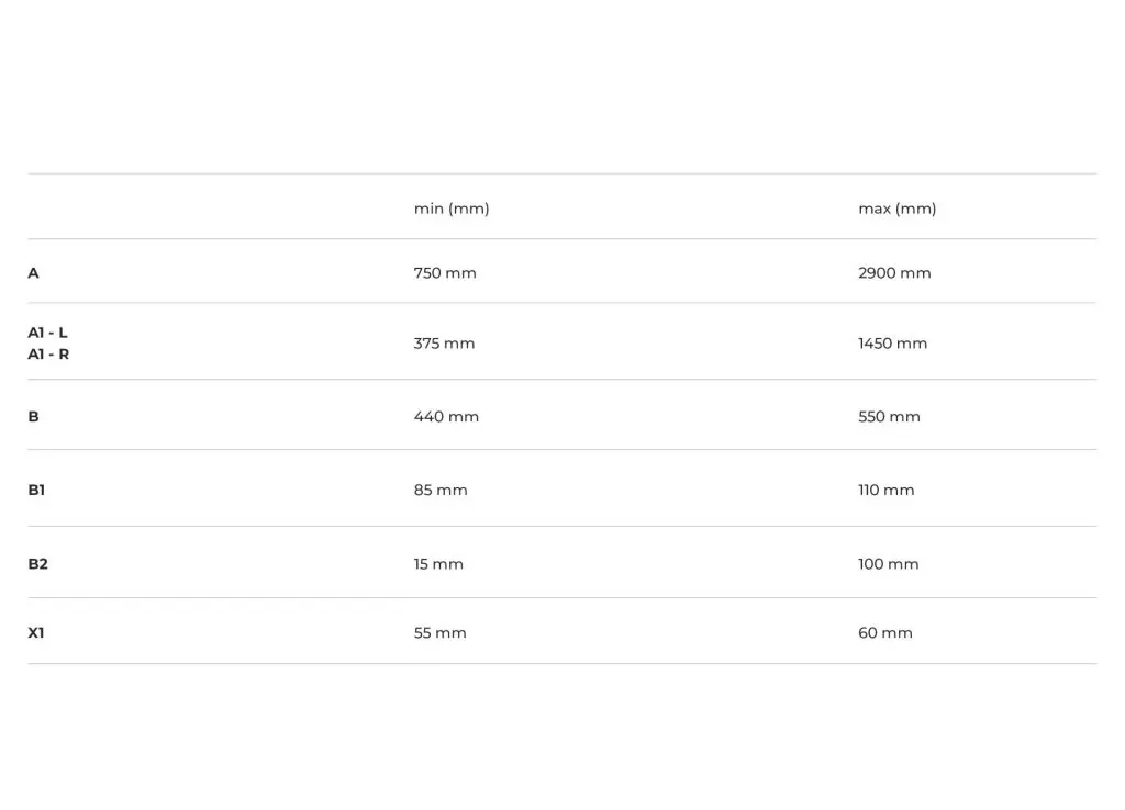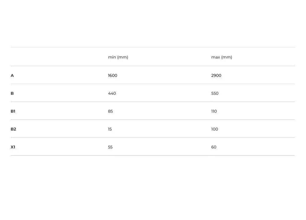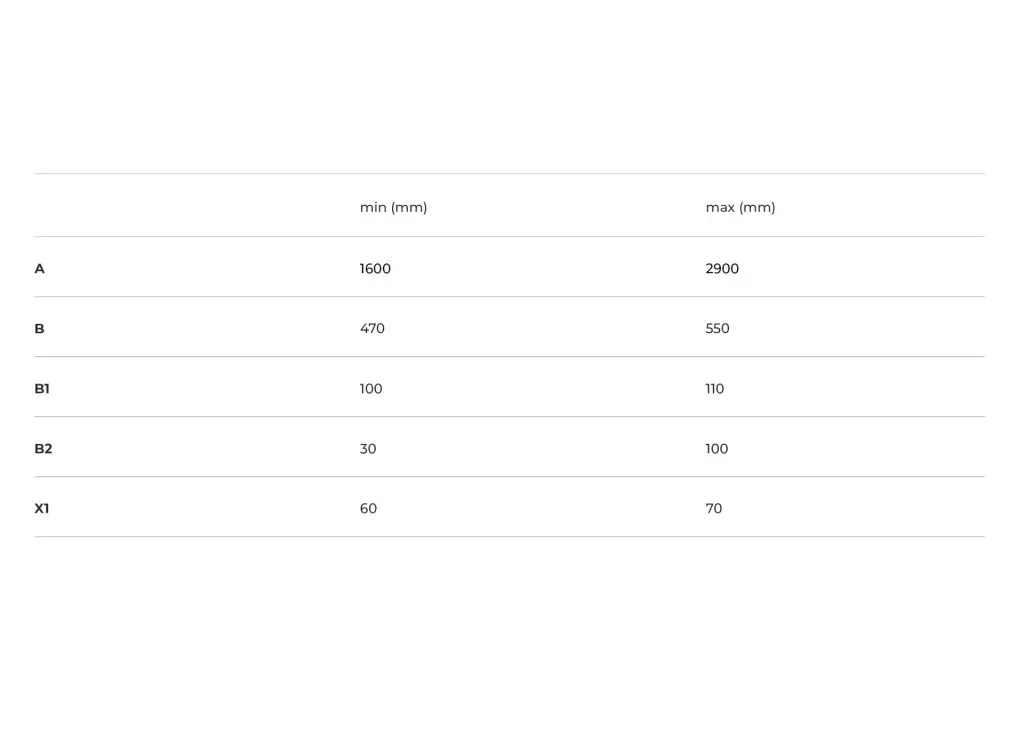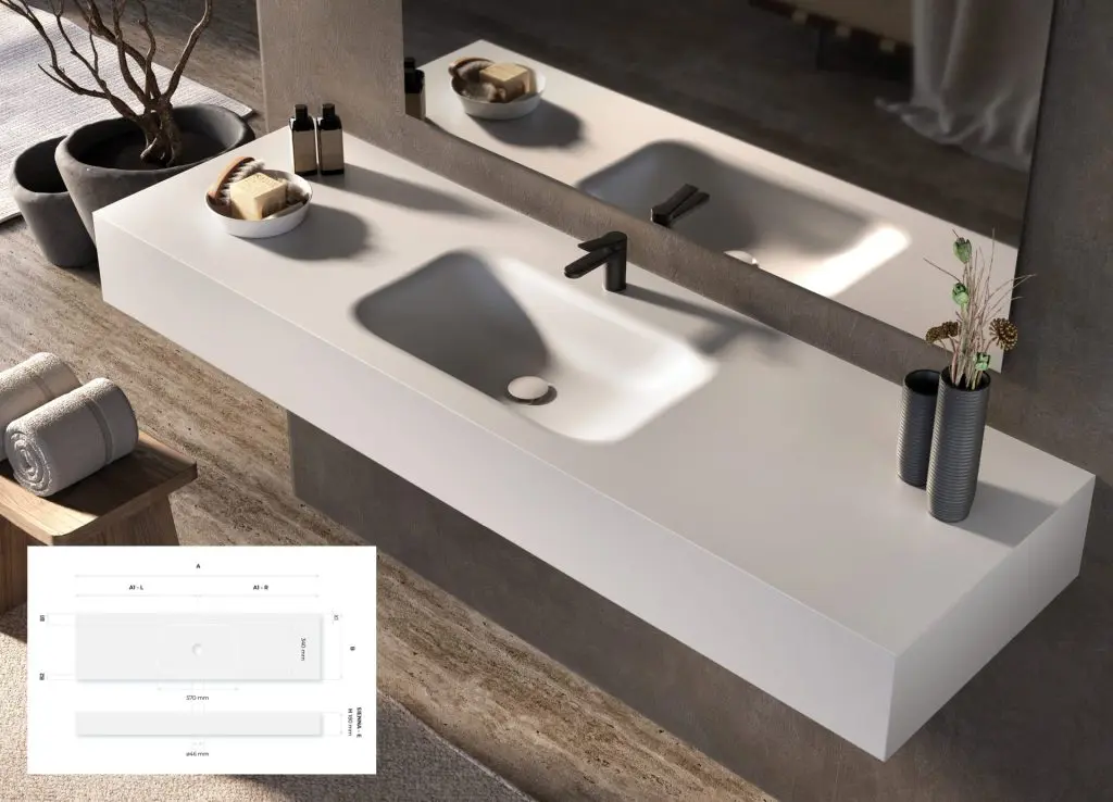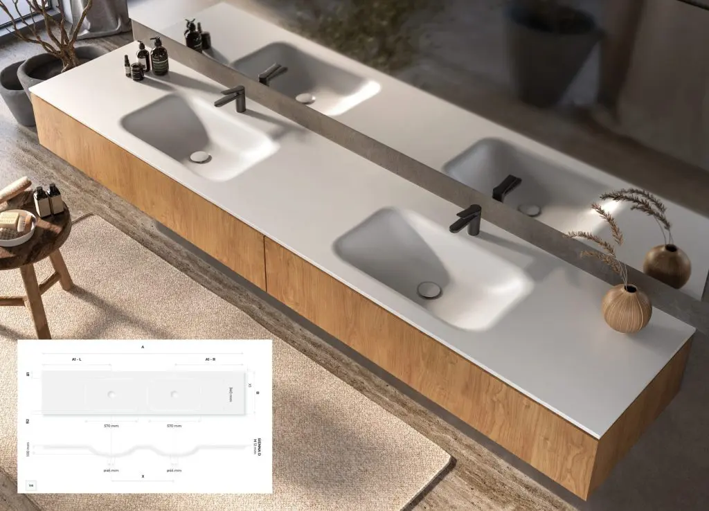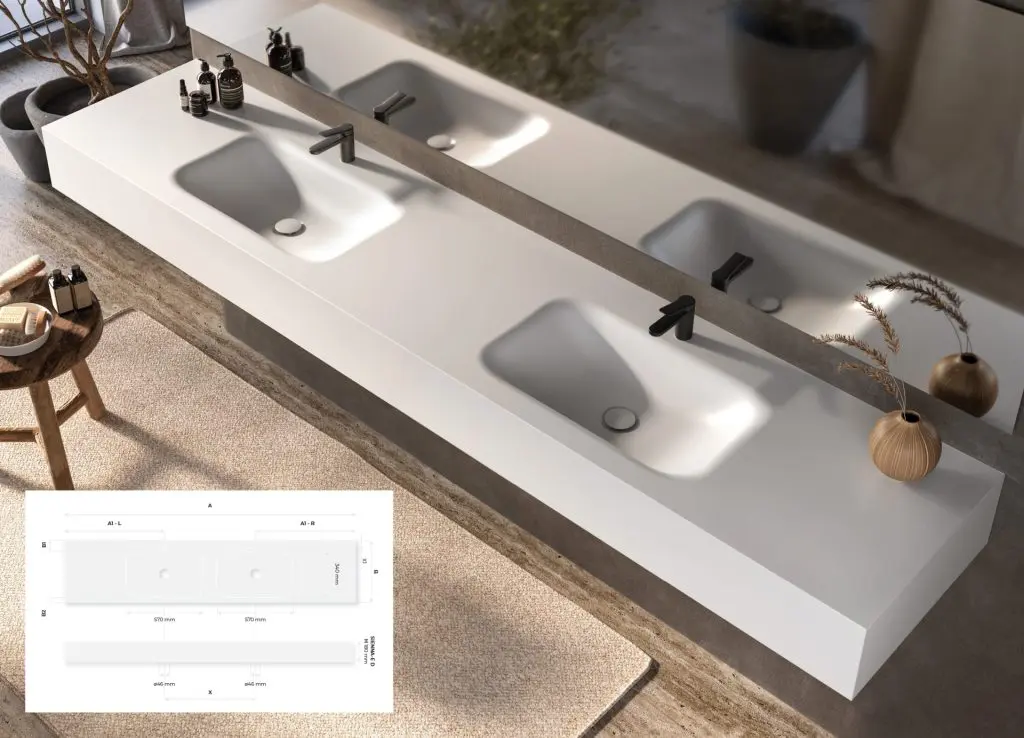 Sienna D: A double vanity top, ideal for larger spaces, with a range of 1600 to 2900 mm, offering more space for simultaneous use.