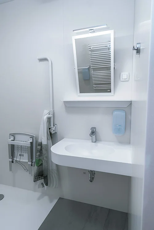 The prefabricated bathroom from Kerrock features wall cladding, a washbasin, a shower and a folding stool. Kerrock is a durable material that is resistant to impact and abrasion, easy to maintain, flame retardant and does not absorb liquids. The surface is even and without visible joints, ensuring aesthetic appeal.