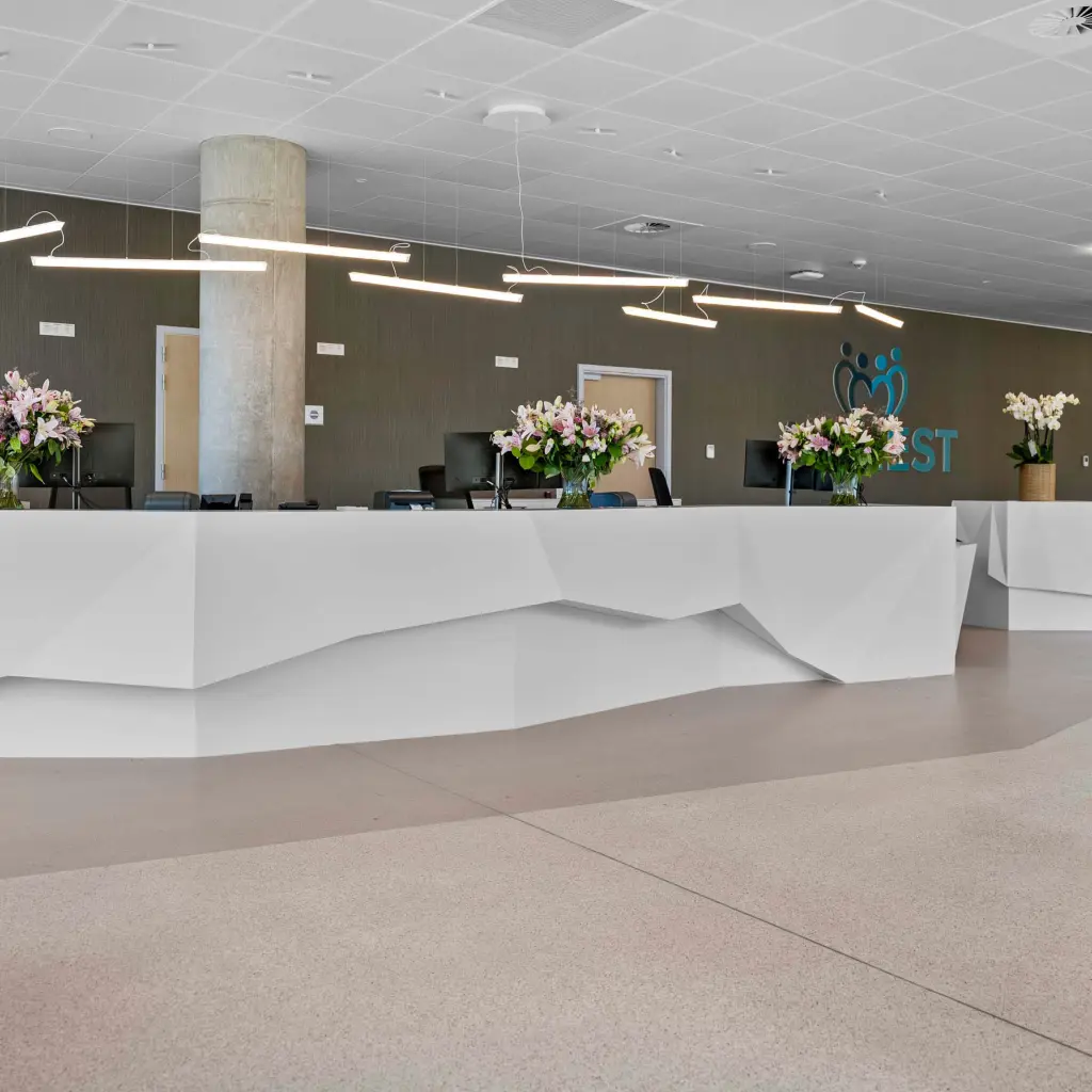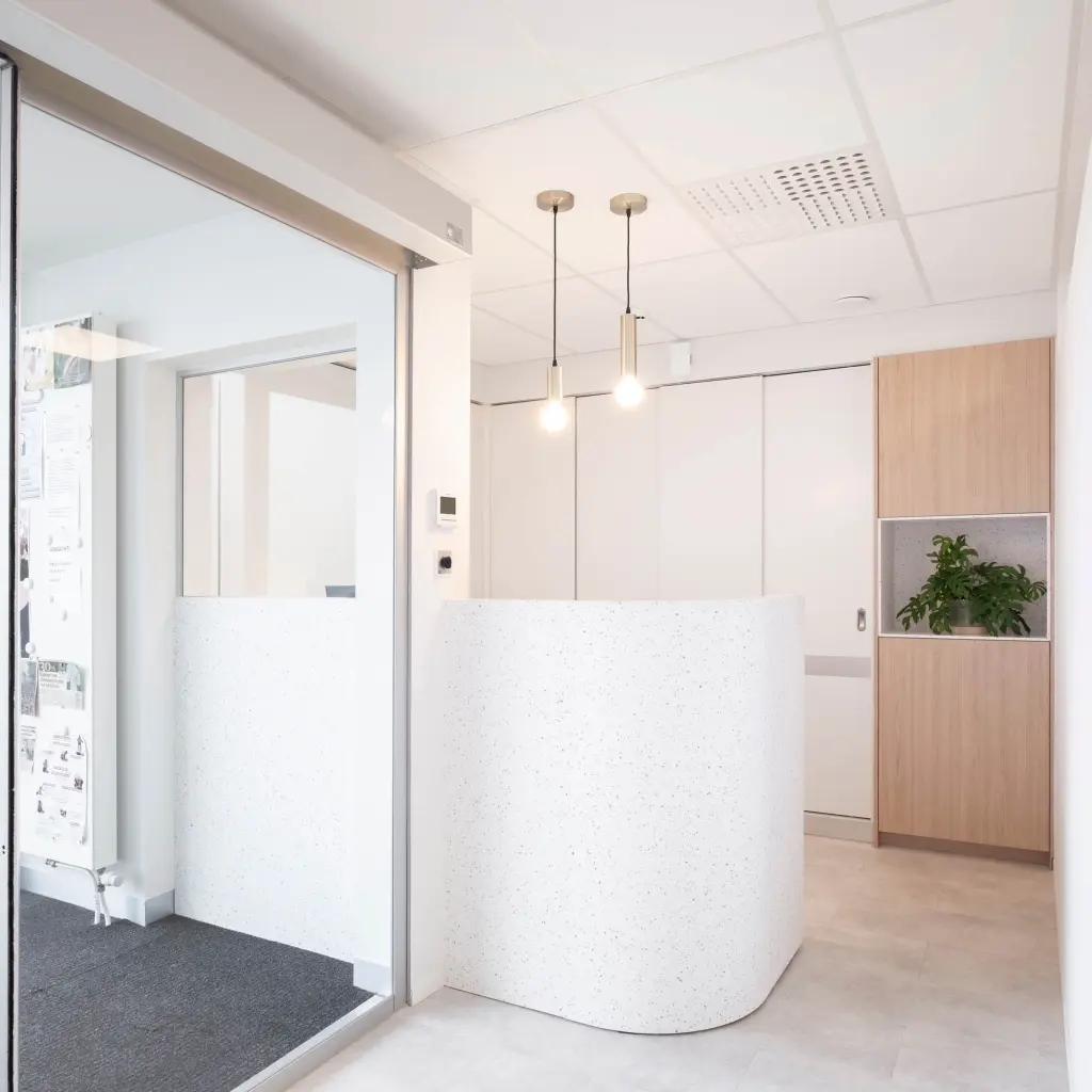 Reception areas are not just about the counter – the entire ambience creates the experience. That is why Kerrock is also used as wall cladding, giving the space an elegant, uniform look while improving the durability of the surfaces.